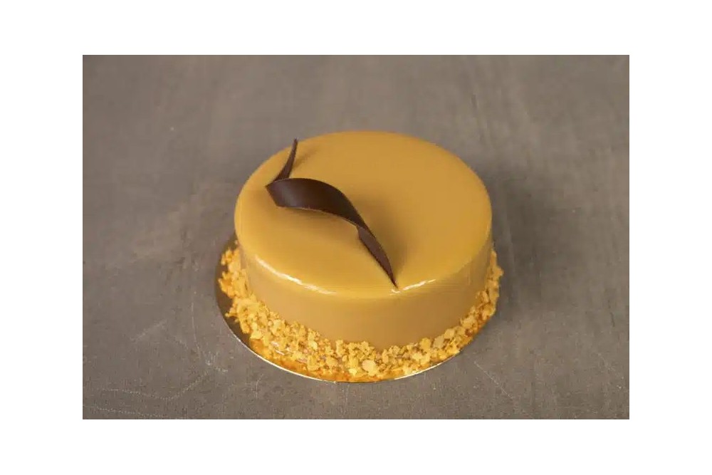 Tort z musem śmietanowym o smaku słonego karmelu i mlecznej czekolady na delikatnym czekoladowym biszkopcie, w dolnej warstwie przełożony chrupiącym krokantem. Oblany karmelową polewą.