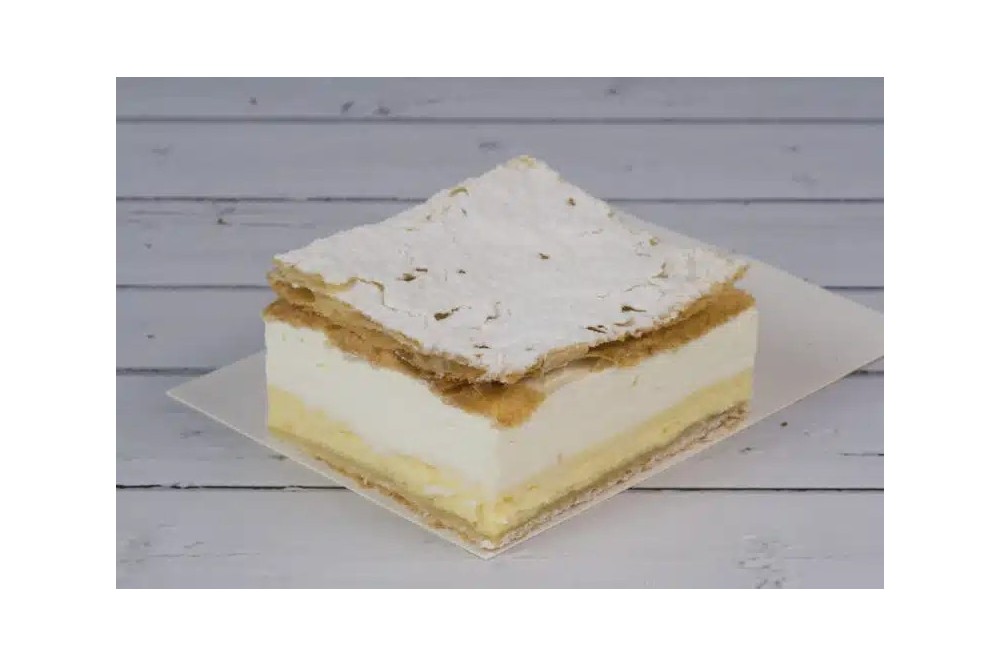 Dwie warstwy ciasta francuskiego, przesmarowane kremem budyniowym oraz białą bitą śmietaną, wykończone cukrem pudrem.