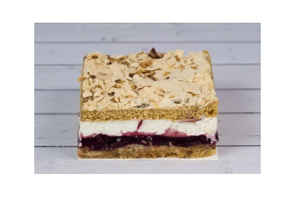 Ciasto na kruchym spodzie, przełożone wiśnią w żelu i orzechami włoskimi, z dodatkiem bitej śmietany. Wykończone puszystą pianką.