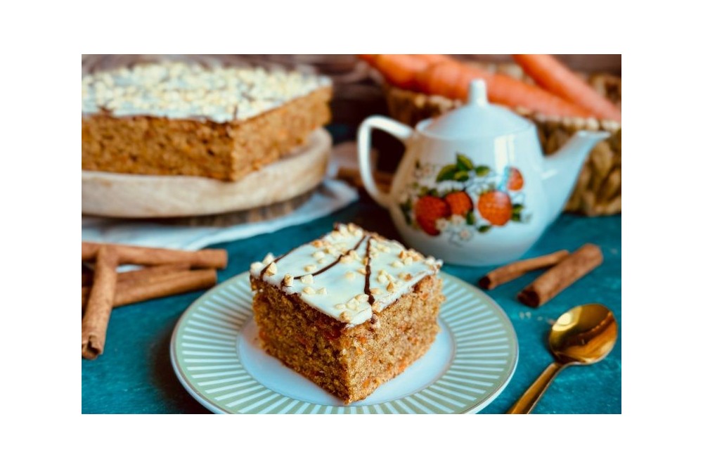 Delikatne i wilgotne ciasto korzenne z dodatkiem marchwi, wykończone polewą czekoladową.