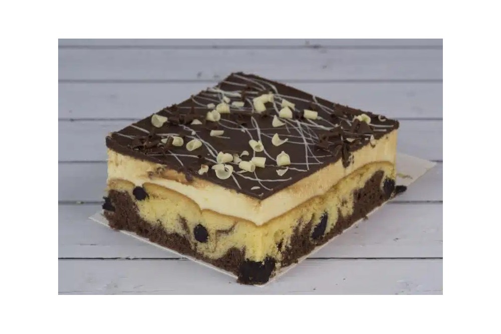 Ciasto biszkoptowo tłuszczowe jasne i kakaowe, z dodatkiem wiśni. Przełożone kremem budyniowym, wykończone ciemną czekoladą i wiórkami czekoladowymi.