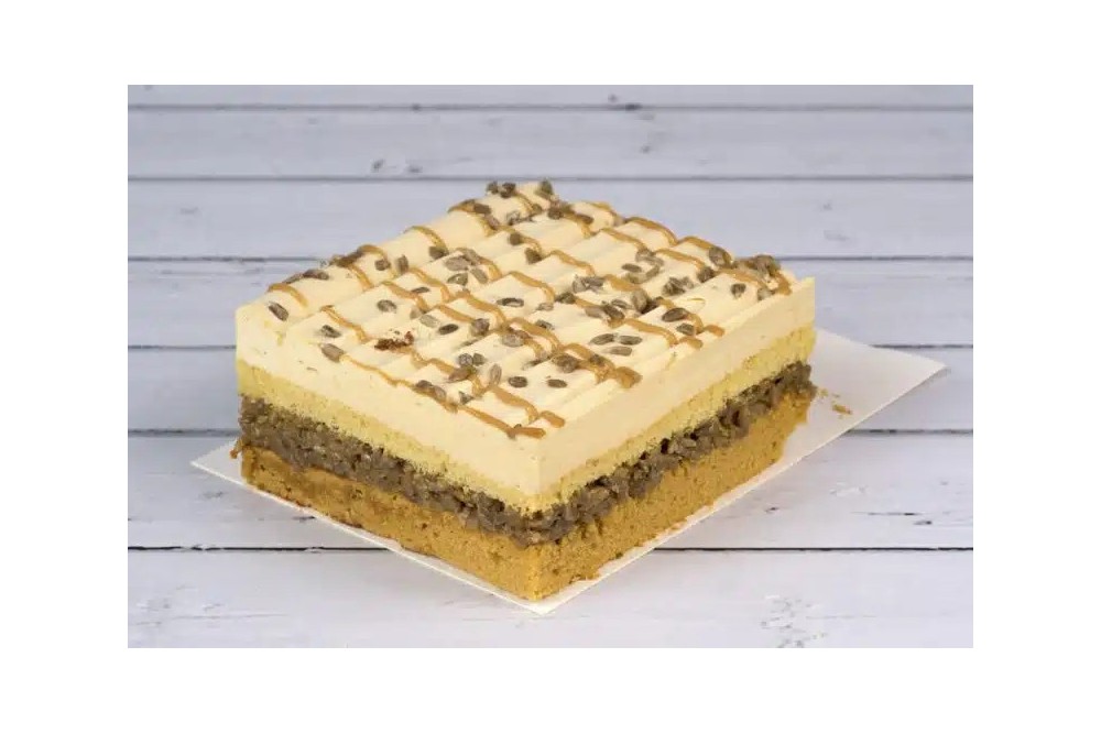 Ciasto na karmelowym spodzie z warstwą słonecznika i nadzienia toffi, jasnego biszkoptu i bitej śmietany o smaku toffi. Całość wykończona delikatną dekoracją