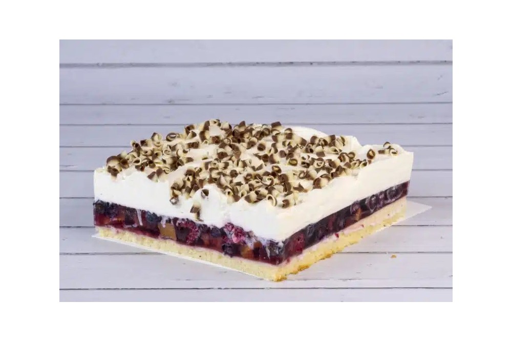 Ciasto na jasnym biszkopcie przesmarowane kremem budyniowym, z dodatkiem warstwy galaretki z owocami, przełożone bitą śmietaną i wykończone wiórkami czekolady.