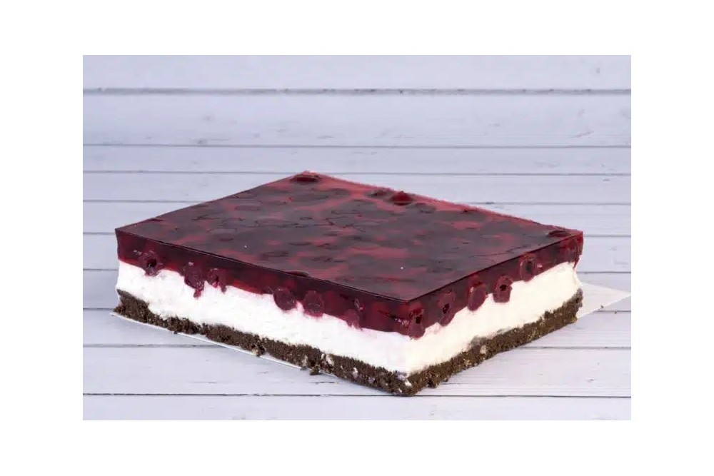 Ciasto na kakaowym spodzie z kawałkami sucharków, przełożone bitą śmietaną jogurtową, z dodatkiem wiśni w kompocie i zalane galaretką owocową.