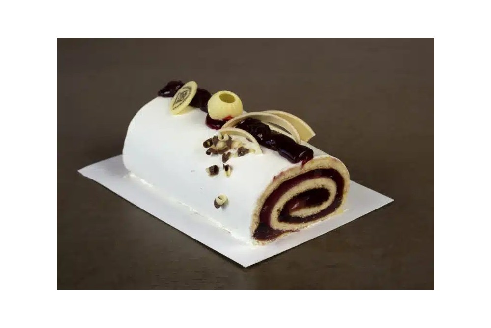 Truskawkowa galaretka zawinięta w cienką warstwę jasnego biszkoptu. Dekoracja wg uznania.