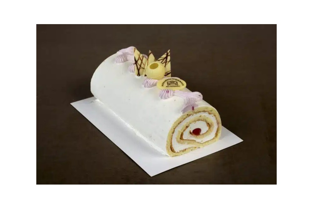 Cienki biszkopt przesmarowany białą bitą śmietaną i zawinięty w przepyszny słodki rulonik. Dekoracja wg uznania.