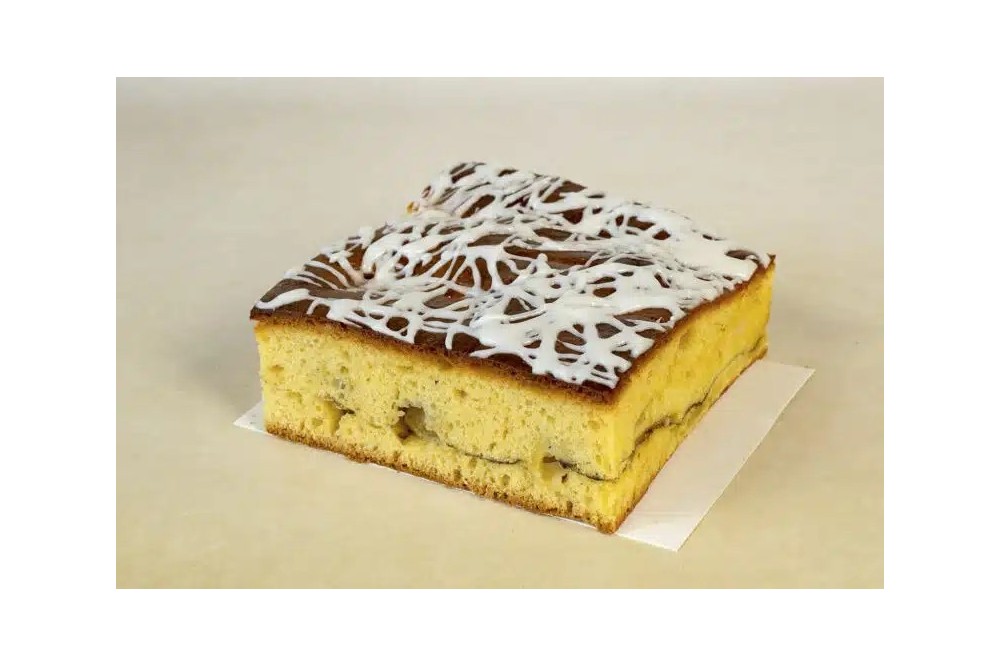 Ciasto na kruchym spodzie, z poukładanymi ćwiartkami jabłek świeżych z cynamonem, zapieczone i udekorowane pomadą.