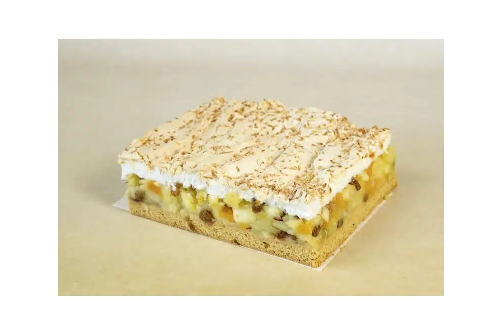 Smaczna warstwa prażonych jabłek, z rodzynkami i brzoskwiniami na spodzie biszkoptowo tłuszczowym. Posypany kruszonką oraz zapieczony z bezą.