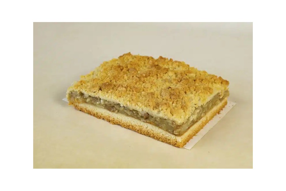 Ciasto na spodzie biszkoptowo tłuszczowym, z jabłkami prażonymi, rodzynkami oraz brzoskwiniami. Ciasto posypane kruszonką.